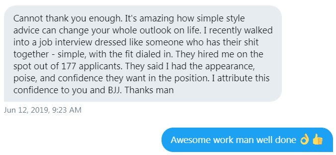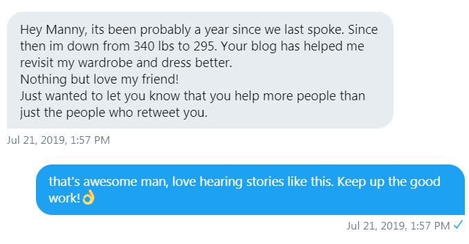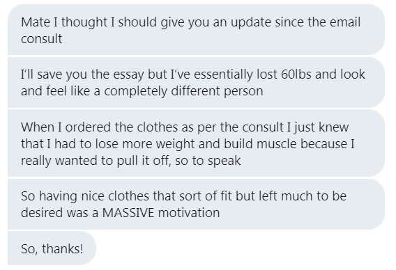 He reached out to Well Built Style and... He effectively changed his life for the better. Quit the job he hated, found a better one. Started going to the gym. Confidence levels skyrocketed. He never thought this simple act of walking up to a stranger could transform his life that way. But it did...