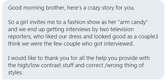 "Oh, I've been following this guy on Twitter for a while. He teaches men how to dress and live a better life. I hired him to create a wardrobe for me not too long ago. This first step was a stepping stone to becoming the man I am now. In hindsight, it changed my life. You can follow him, his Twitter is @wellbuiltstyle."